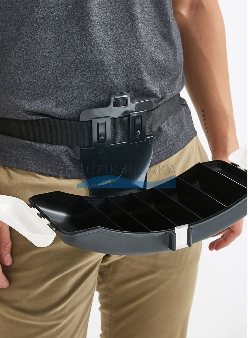 Meiho Waist Hunter — удобная коробка для приманок на пояс. Она имеет изогнутую форму, за счет чего плотно прилегает к талии и абсолютно не сковывает движения во время рыбалки. Удобно смещается относительно ремня во время использования. Коробка изготовлена из ударопрочного пластика ABS, защелка металлическая. Конструкция разработана для тяжелых условий ходовых рыбалок.