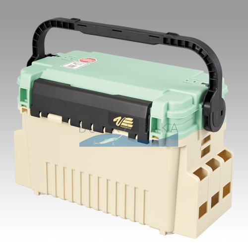 Ящик изготовлен из ударопрочного пластика в стильном агрессивном дизайне с зеленой крышкой. Он рассчитан на эксплуатацию в самых суровых условиях. По бокам имеются специальные фиксаторы: на ящик можно закрепить до четырех стаканов-держателей для удилищ Meiho серии BM.